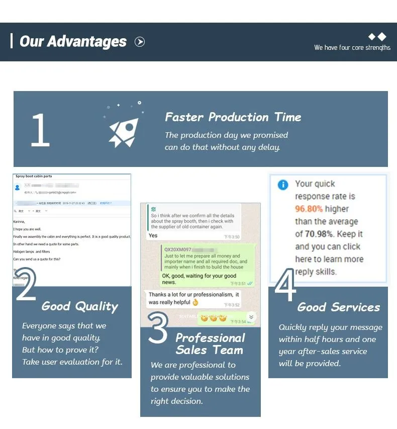 Plné využitie technológie na ochranu životného prostredia, bezpečnosti a ochrany životného prostredia, zlepšená prevádzka, vykurovací systém nevyžaduje na spustenie vysoký prúd a odvod tepla sa rýchlo vyhýba skrytým bezpečnostným rizikám v kabíne na natieranie paliva.